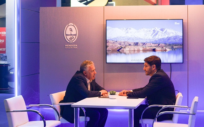 Cornejo reunido con Pullaro en stand de Mendoza en Arminera, otro cipayo al servicio de las corporaciones. Y se dicen, además, “radicales”. (Foto: Prensa GdM).