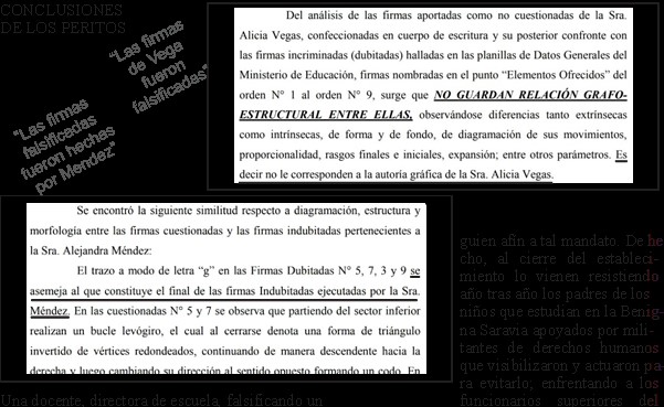 Finalmente, el Cuerpo de Investigaciones Fiscales (CIF) terminó por evidenciar que Alicia Vega decía la verdad. El informe de los peritos -oficiales y de parte- concluye que las firmas en las planillas de datos generales no fueron efectuadas por Vega y, peor aún, sí por la directora Méndez; es decir, “Méndez las falsificó”. Ante esto, una denuncia penal pesará ahora sobre Méndez.