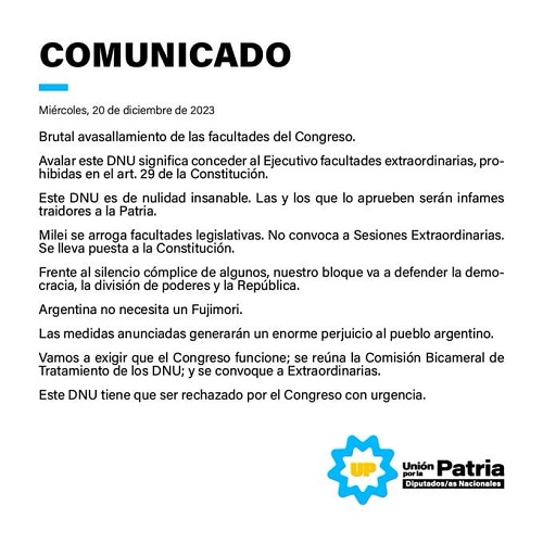 Pero casi al instante hubo comunicado de Unión por la Patria, dando a conocer fuerte como explícitamente postura frente al decretazo del régimen autoritario de Milei. En la parte sustancial del comunicado dice: “Brutal avasallamiento de las facultades del Congreso. Avalar este DNU significa conceder al Ejecutivo facultades extraordinarias prohibidas por el Art. 29 de la Constitución. Este DNU es de nulidad insanable. Las y los que lo aprueben serán infames traidores a la Patria”, en las partes más saliente del mismo.
