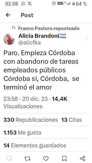 Desde Córdoba, la dirigente Alicia Brandoni informó que “hoy comienzan paro en toda la administración pública”. Por otro lado, se dijo que “esto se hace por fuera de las organizaciones gremiales cordobesas, donde creen que se cree que se acabó el amor con el schiarettismo y el llaryorismo”.
