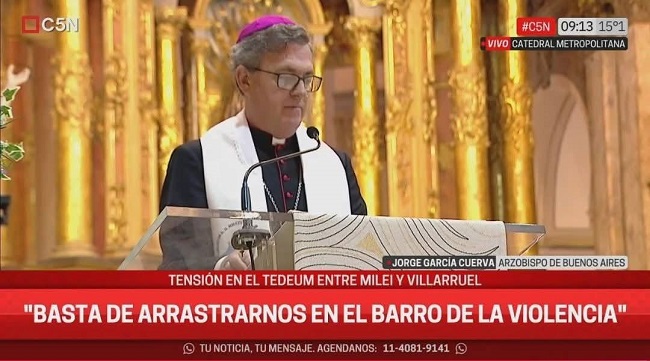 Washington Uranga de Página 12 es el que mejor describe las palabras del arzobispo de Buenos Aires, cuando expresa en su nota de hoy: “García Cuerva fue el único orador y, como lo hizo en ocasiones anteriores, comenzó advirtiendo que sus palabras ‘quieren ser un aporte, a la luz de la Palabra de Dios, para la reflexión de todos los actores de la sociedad argentina’, aun sabiendo que luego, algunas frases puedan ser tomadas de manera aislada para querer alimentar la fragmentación.