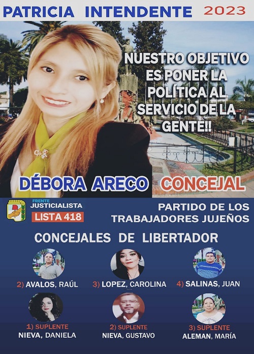 El pensamiento de Areco se encuadra en que ha visto participar a la candidata a intendenta por Libertador y máxima referente de la Lista 505, Patricia Gutiérrez, desde hace mucho tiempo: “Por ello creo que se merece el lugar que ha alcanzado, por su trabajo y coherencia. Y hoy es la única que tiene un proyecto serio para Libertador y su gente. Y ello lo viene exponiendo en diferentes tribunas y espacios como medios. Ha llegado su hora. Nosotros nos congratulamos por ello y desde nuestra lista la apoyamos, ya que somos una de las colectoras para que una mujer llegue a la intendencia en Libertador”, dice la candidata a concejala en primer término por la Lista 418, Partido de los Trabajadores Jujeños.