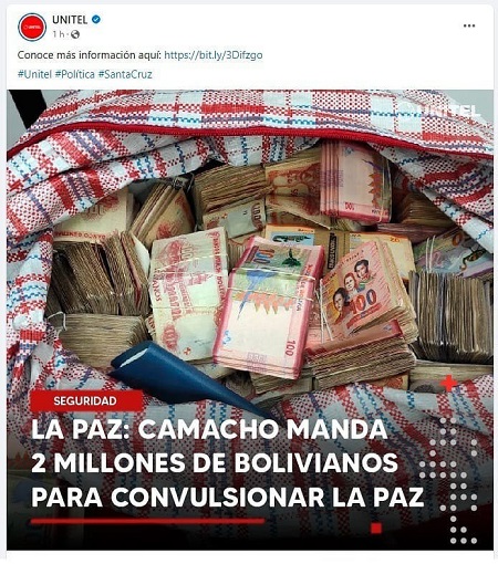 El portal Unitel denunció al gobernador cruceño Luis Fernando Camacho por el envío de dinero a grupos de revoltosos en La Paz. (Foto: Unitel-Twitter).