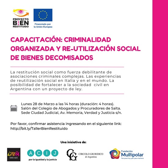 El taller estará a cargo de representantes del proyecto “BIEN RESTITUIDO – Para el desmantelamiento patrimonial del delito organizado y el fortalecimiento de la sociedad civil” (bienrestituido.org.ar/), una iniciativa liderada por la organización italiana Libera, junto con organizaciones civiles argentinas: Fundación Multipolar, Asociación Civil por la Igualdad y Justicia (ACIJ) y el Circolo Giuridico di Argentina. El proyecto fue seleccionado en el año 2021 en la convocatoria CooperAR-UE de la Delegación de la Unión Europea en Argentina, y es co-financiado por la Organización Internacional Ítalo-Argentina (IILA).