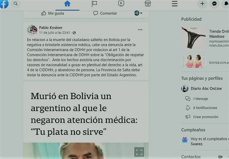 También se había dirigido con notas de reclamo el secretario de Relaciones Internacionales del Gobierno de la Provincia, Julio San Millán, a distintos organismos de Derechos Humanos nacionales, Cancillería y Comisión Interamericana de DD.HH. de la OEA. Pero resulta que ahora se sumó el ex diputado nacional peronista por Salta Pablo Kosiner, quien expresó en sus redes sociales palabras de dureza contra las autoridades de salud de Bolivia por la atención recibida por el docente Alejandro Benítez. Lo que no dijo Kosiner, es que el ex presidente de Bolivia Evo Morales, de reciente visita en el país, hizo aclaración al respecto. [1]